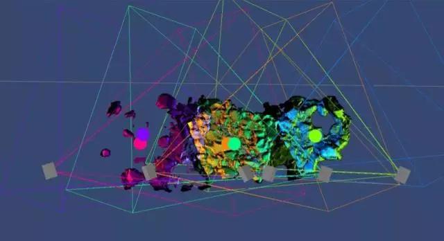 這是劉佳玉創(chuàng)作的投影作品《The Riverside》,展出于英國(guó)倫敦Watermans Art Centre的 Riverside Gallery內(nèi)。一條位于北京,穿過(guò)長(zhǎng)城的小溪被選中其中的一段,藝術(shù)家通過(guò)3D實(shí)地掃描這段干涸后的河床,并通過(guò)CNC制成混凝土河床,長(zhǎng)8米,寬3.5米。然后使用Houdini創(chuàng)建流體粒子效果伴隨VVVV實(shí)時(shí)渲染,最終使用6臺(tái)高清投影儀進(jìn)行與泰晤士河同樣自西向東的河流映射。