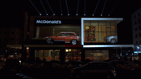 在3D投影效果天衣無縫的包裹下,這家在街頭散發(fā)著獨特氣質的快餐廳又更添了一份迷幻色彩。投影的動畫由多組不同畫風的短片組成,每一段都恰到好處地展現(xiàn)了該店各項特色服務和亮點,包括餐廳的品牌形象,當?shù)氐姆值甑刂罚餍钱a(chǎn)品的展示,以及汽車外送服務流程等等。如果在這家店用餐,漢堡或許依舊是那個熟悉的味道,但吃漢堡的心情卻變得不一樣了。