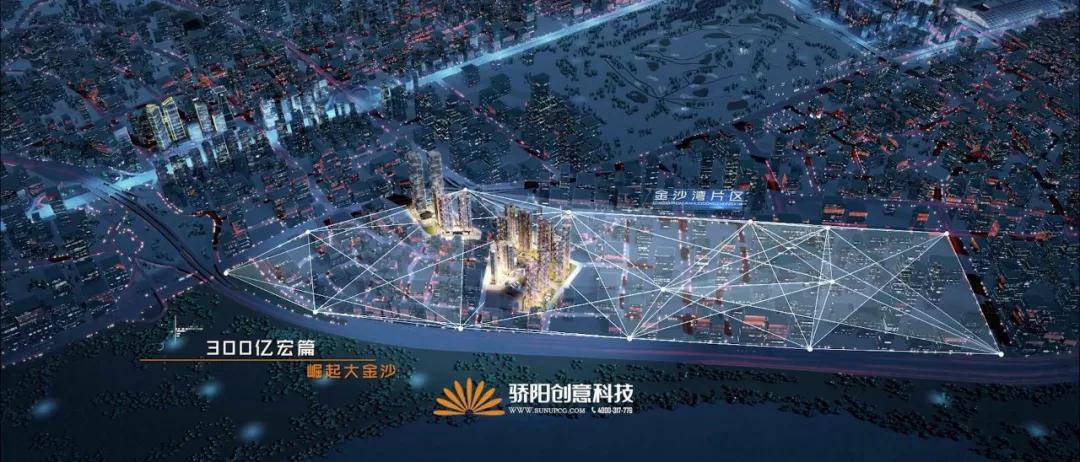 鏡頭俯沖而下,以項目為視覺軸心鋪展大金沙舊改片區;用特效包裝展示該片區規劃格局,以烘托本案承載重塑城市中心,完善深圳灣區的的價值。