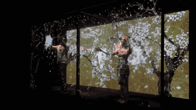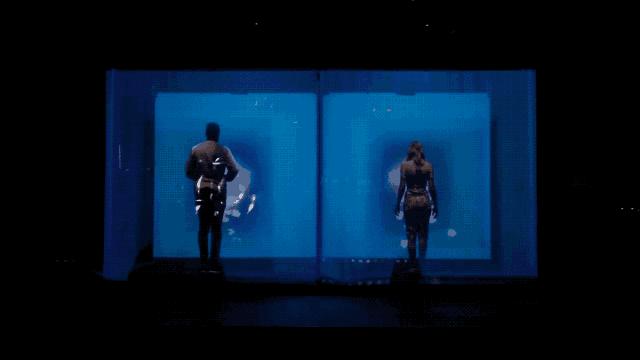 整個互動空間由一個巨大的立方體組成,參與者前后的墻面幾乎是是透明的,當(dāng)投影將畫面輸出至屏幕中時,強(qiáng)大的代入感使參與者感覺像是圖像漂浮在空中一般。
