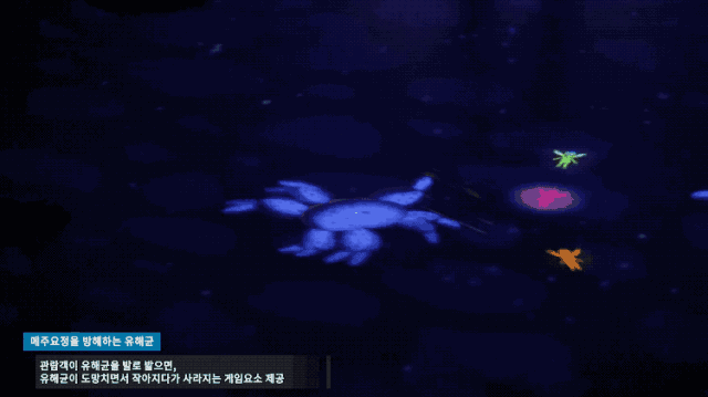 整個房間,屋頂和地面,全都被投影動畫所包裹。這些動畫中,各種千奇百怪的生物四處飄蕩,如果互動者觸碰或是踩到這些生物,他們就會挪動位置或是躲藏起來,這是因為房間的四周安裝有動作捕捉攝像頭,它們會捕捉參觀者的行為,從而作出互動。