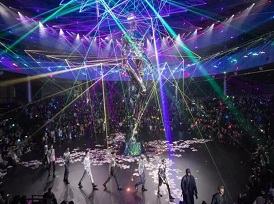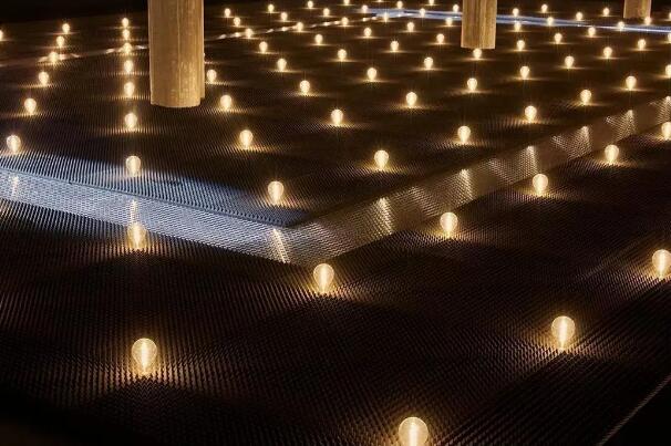 這是奢侈品牌 PRADA 2019秋冬女裝時裝大秀,PRADA 基金會大樓的多功能表演場,被OMA 建筑事務所打造成了一個夢幻秀場。大量呈網狀排列的燈泡裝飾著舞臺,時裝表演和藝術景觀在這里結合,給觀眾帶來做夢一般的感受。