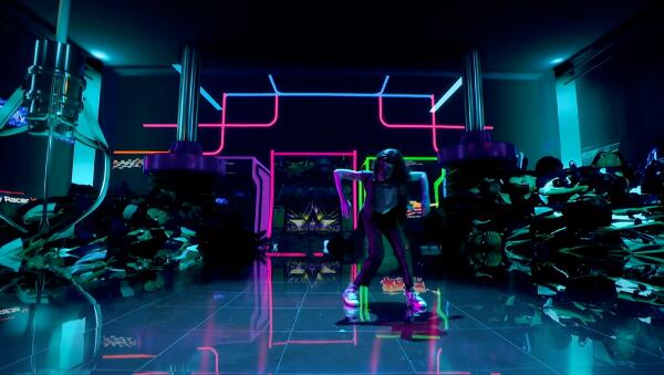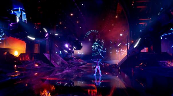 另一個難點是舞臺上地板的反光。由于xR場景表演在弧形LED舞臺上拍攝,其地板有較強的反光。設計團隊在創作和拍攝時,要同時考慮到真實世界的反射和虛擬世界的反射。于是,設計師通過使用實時 DMX 數據來控制數百個虛擬 DMX 燈具,以操縱虛擬環境中的照明。