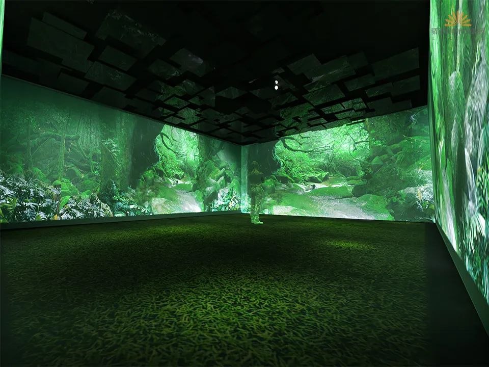 沉浸式cave影廳區域則采用投影形式營造“咖啡森林之境”沉浸式空間,以“生命力”的概念表達咖啡的生長過程。