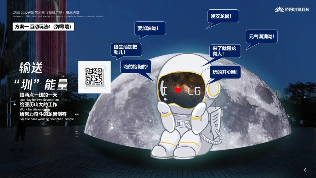 手機(jī)掃描二維碼,與宇航員進(jìn)行互動(dòng),你的“圳能量”通過實(shí)時(shí)交互技術(shù)呈現(xiàn)在宇航員面罩上,給兩點(diǎn)一線的一天,給亞歷山大的工作,給努力奮斗的龍崗夢(mèng)想家,給所有素未蒙面的陌生人,一句溫暖的文案,加加油,打打氣。