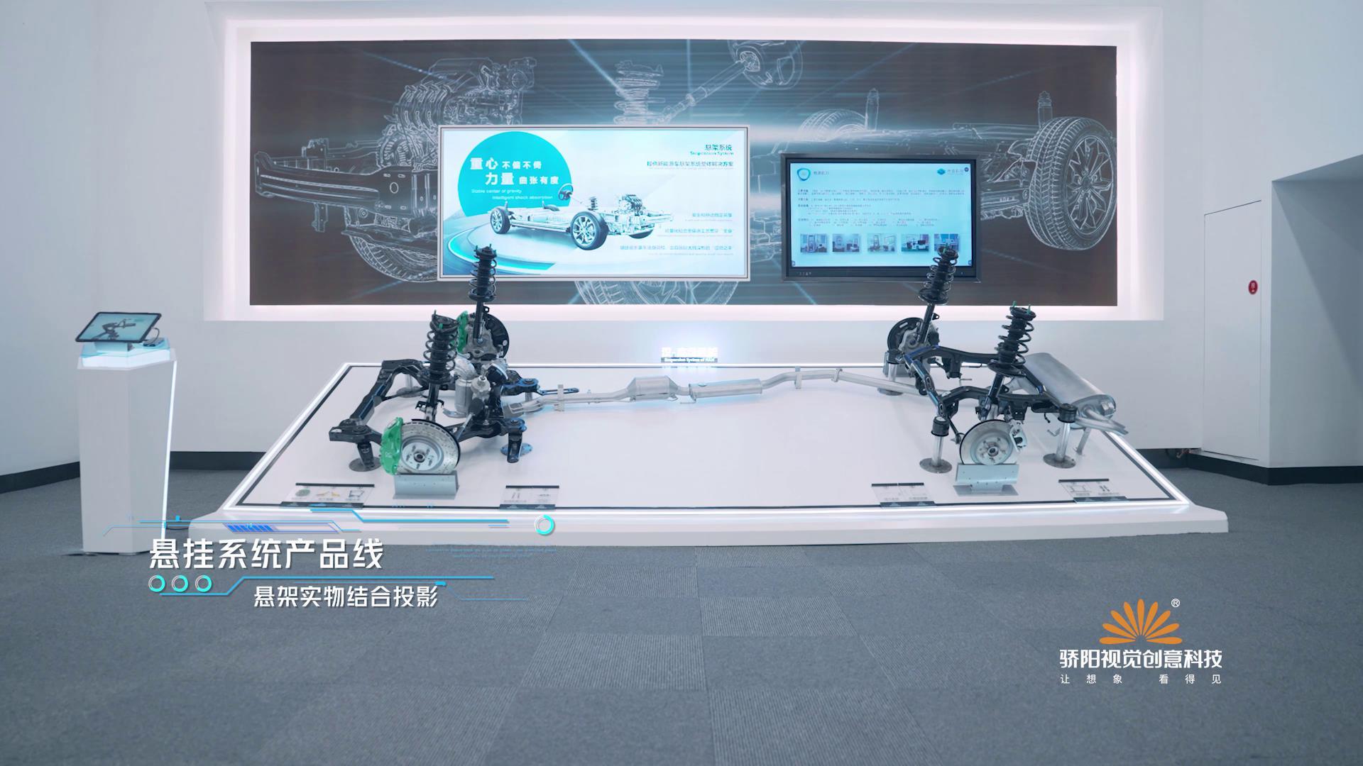 使用AR技術,通過平板掃描實物模型,疊加出奔跑的比亞迪漢。客戶在現實與虛擬中穿插中了解懸掛系統產品及性能。同時在平板中拖拽放大產品模型,細致的展現比亞迪生產工藝。