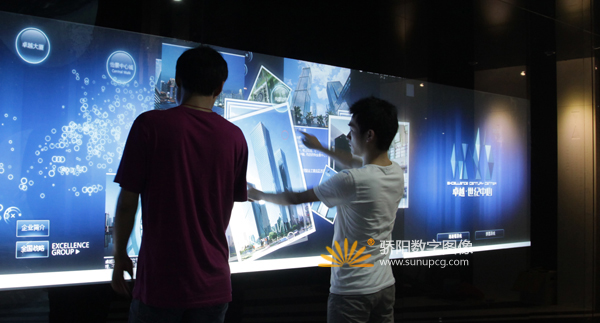 驕陽采用背投3通道投影,結合紅外攝像頭采集技術,制作出一個4.8米*1.2米 的多點互動墻。觸摸墻利用多觸點觸摸技術、多屏投影拼接技術和多媒體技術,可以提供多達數平方米,供十余人同時查詢、觀看的數字展臺,是數字展館、大型展覽活動的展示形式。其特點有:可供多人同時查閱資料;按照展覽裝備的型號合理設置查詢目錄結構,清晰明了便捷;硬件設備可多次實用,安裝及搬運方便。