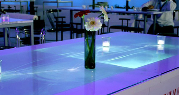 互動(dòng)吧臺(tái)系統(tǒng)是通過背投式投影拼接融合技術(shù)和激光平面多點(diǎn)觸摸技術(shù)(簡(jiǎn)稱LLP)來識(shí)別桌面物體,并在其之間產(chǎn)生多種互動(dòng)粒子效果,玩家可以通過手指或移動(dòng)物體來體驗(yàn)。其內(nèi)容主要是以視覺展示和互動(dòng)體驗(yàn)為主。