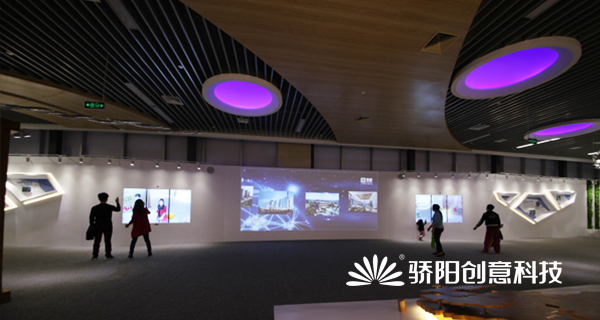 該項目由位于中央的兩通道投影與左右各一組的三連屏進行創意拼接。融合了影片播放、PPT展示及兩款互動游戲(功夫西瓜與照片墻)于一體,是展示方式的一次小小的創新。雖然項目周期很短,從創意策劃到實施僅僅一個月的時間,而且裝修完成后,留給我們的程序編程及系統測試的時間只有兩天。但驕陽展覽展示部項目部、工程部與研發部的同事加班加點,夜以繼日,終于在開館的前一天結束了所有安裝調試工作,保證了展廳的順利開放。經過了現場觀眾的考驗,也得到了客戶領導的一致好評。