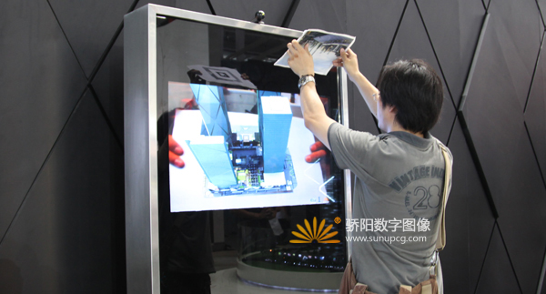 通過特定的媒介,將觀者手中宣傳卡上的畫面在屏幕中3D成像為立體的樓宇,同時畫面自動調出相關的樓盤信息。讓客戶在玩味AR互動這一神奇設備的同時,清楚直觀的了解到自己選擇的信息,可謂“邊玩邊學”。