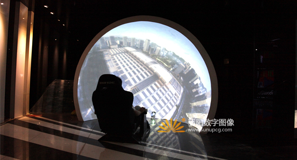透過一個窗口,真實體驗CBD中心區的高瞰風景,便是互動球幕的設計初衷。互動球幕由橢圓的屏幕和一個座椅組成,座椅上裝有軌跡球。觀者坐上座椅通過控制軌跡球調節觀看視角與屏幕畫面,在鳥瞰風景的同時了解并記住卓越CBD商圈核心的區位,以及周邊的各種商業與景觀配套。