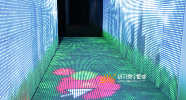 LED屏接墻構成特色時光走廊,運用觸點智能化反應技術,讓畫面以人為中心變換集中,漫步走過,花兒綻放、鳥語蝶飛,動態的自然景象隨人而動,夢幻般的世界在這個瞬間觸手可及,讓觀者感覺卓越以客戶為中心的人性化理念。