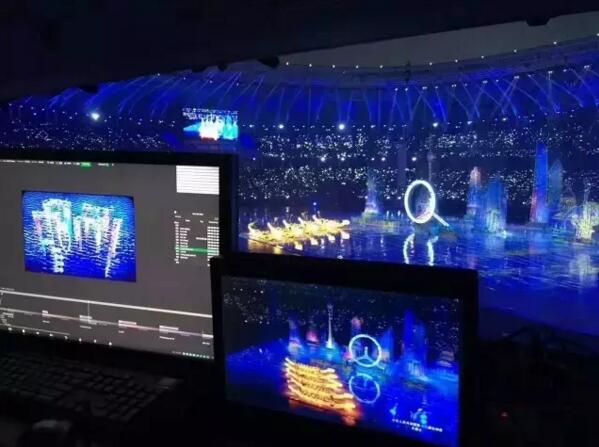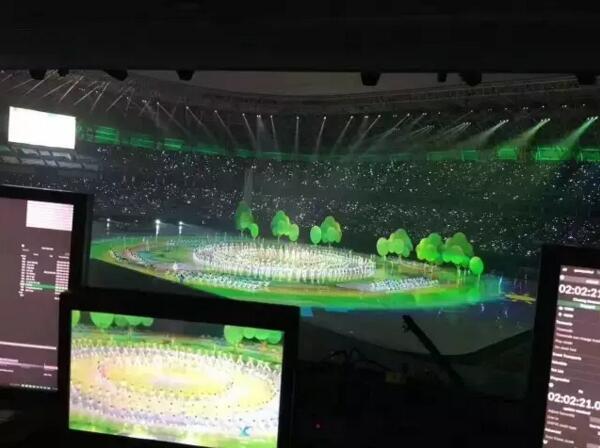現(xiàn)場投影mapping播控團(tuán)隊:Redline 通過d3八臺4*4Pro兩臺2*2 Puls服務(wù)器承載了74臺31000流明松下激光投影機(jī)、24臺12000流明松下激光投影機(jī)的畫面輸出,實時熱備份。主擴(kuò)聲系統(tǒng)選用JBL VERTEC®系列三分頻高指向性線陣列音箱。調(diào)音臺選用了Soundcraft Vi系列數(shù)字調(diào)音臺,由一臺Vi5000和一臺Vi600分別作為主備調(diào)音臺使用。