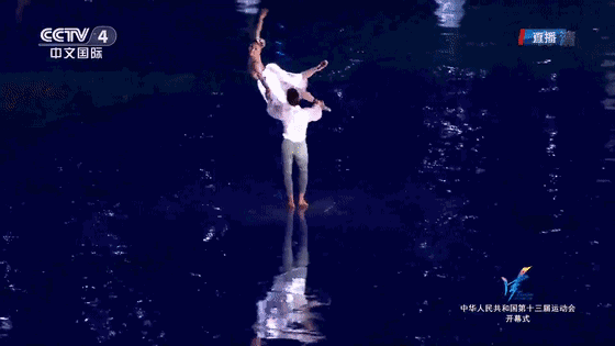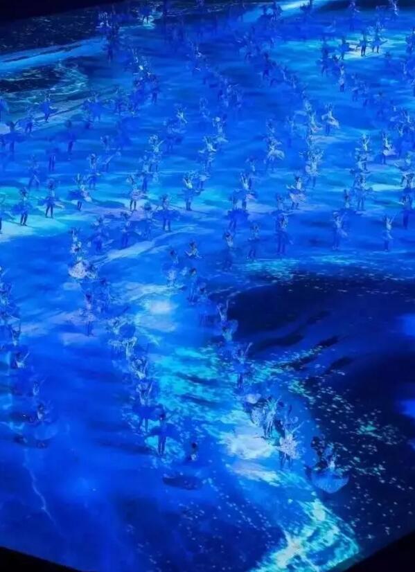 開幕式序曲中代表天津形象的津娃從天而降,躍入3D投影投射的水中,激起裸眼3D的波浪倒計時,現(xiàn)場效果非常立體逼真。
